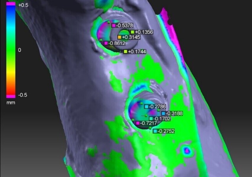Fig. 3: The placement of measuring points on implants WG01rm and WG01rd. The grey test model with implants was superimposed upon the reference model and deviation levels marked.