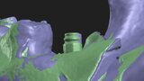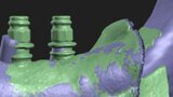 Fig. 7: Implants FH01rm and FH01rd, lingual view. The figure shows two superimposed models. The green model is one with implants and the purple model one with inserts. It can be easily observed that, despite the small spatial displacement of the implant relative to the insert, their axes are convergent.