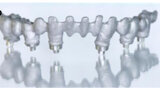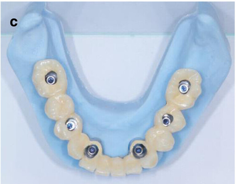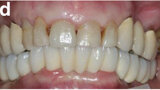 Fig. 7c: CAD/CAM model with the prefabricated titanium abutments (a), CAD/CAM cobalt–chromium framework (b) and composite veneered provisional FDP (c & d) before bonding to the abutments.