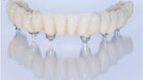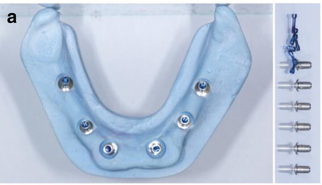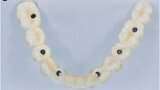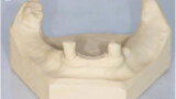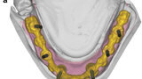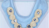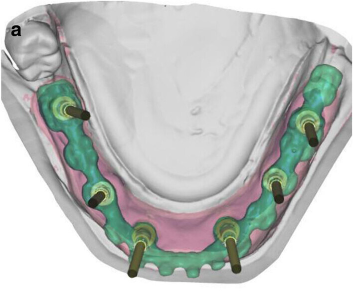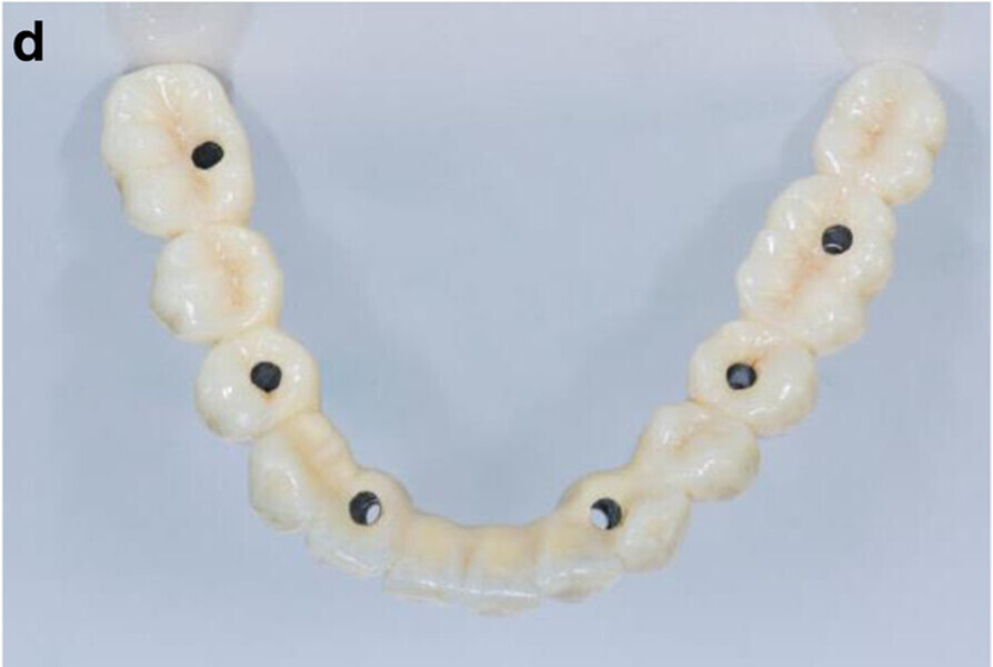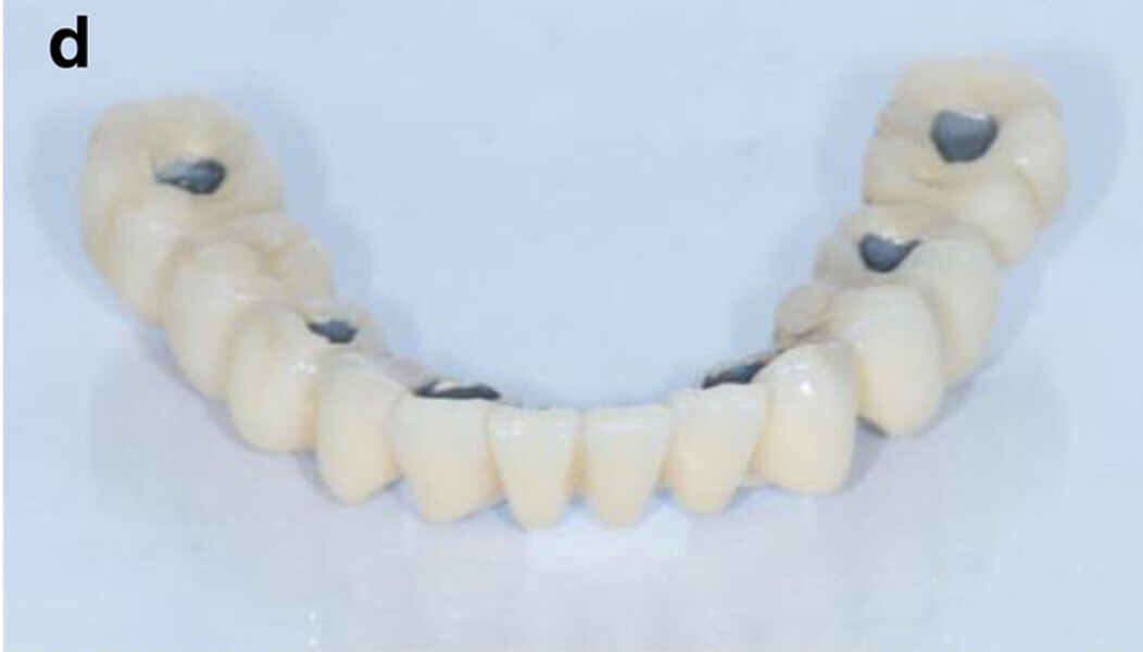 Fig. 7d: CAD/CAM model with the prefabricated titanium abutments (a), CAD/CAM cobalt–chromium framework (b) and composite veneered provisional FDP (c & d) before bonding to the abutments.