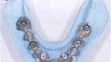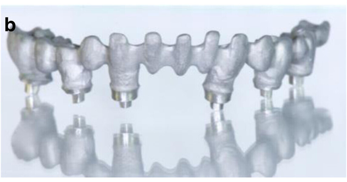 Fig. 7b: CAD/CAM model with the prefabricated titanium abutments (a), CAD/CAM cobalt–chromium framework (b) and composite veneered provisional FDP (c & d) before bonding to the abutments.