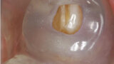 Fig. 8a: Close-up view of the first CAD/CAM guide in situ (tooth- and mucosa-supported) showing the perfect fit on tooth #33 (a). Occlusal view of the second CAD/CAM guide (implant- and mucosa-supported) after extraction of teeth #42 and 33 and placement of implants in positions #44 and 35 (b).