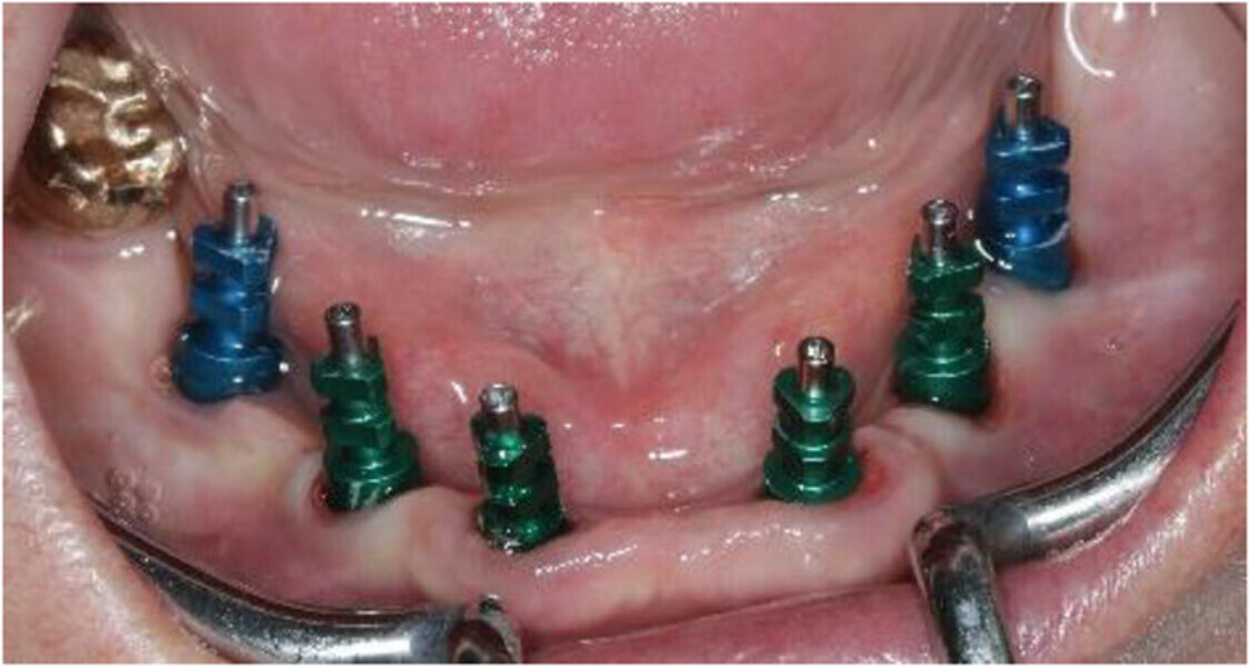 Fig. 11: Frontal view showing the screw-retained posts at impression taking 24 weeks after implant placement.