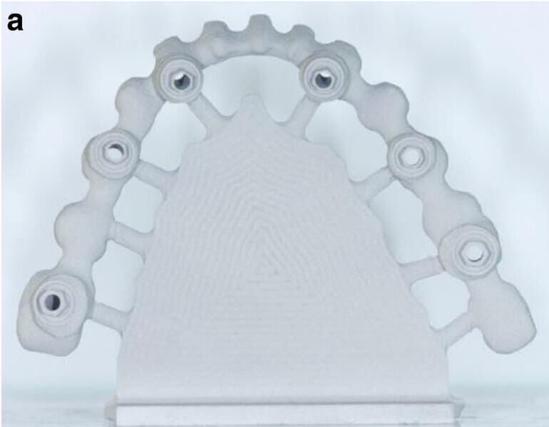CAM-fabricated surgical guides: tooth- and mucosa- supported (a) and implant- and mucosa-supported (b).