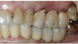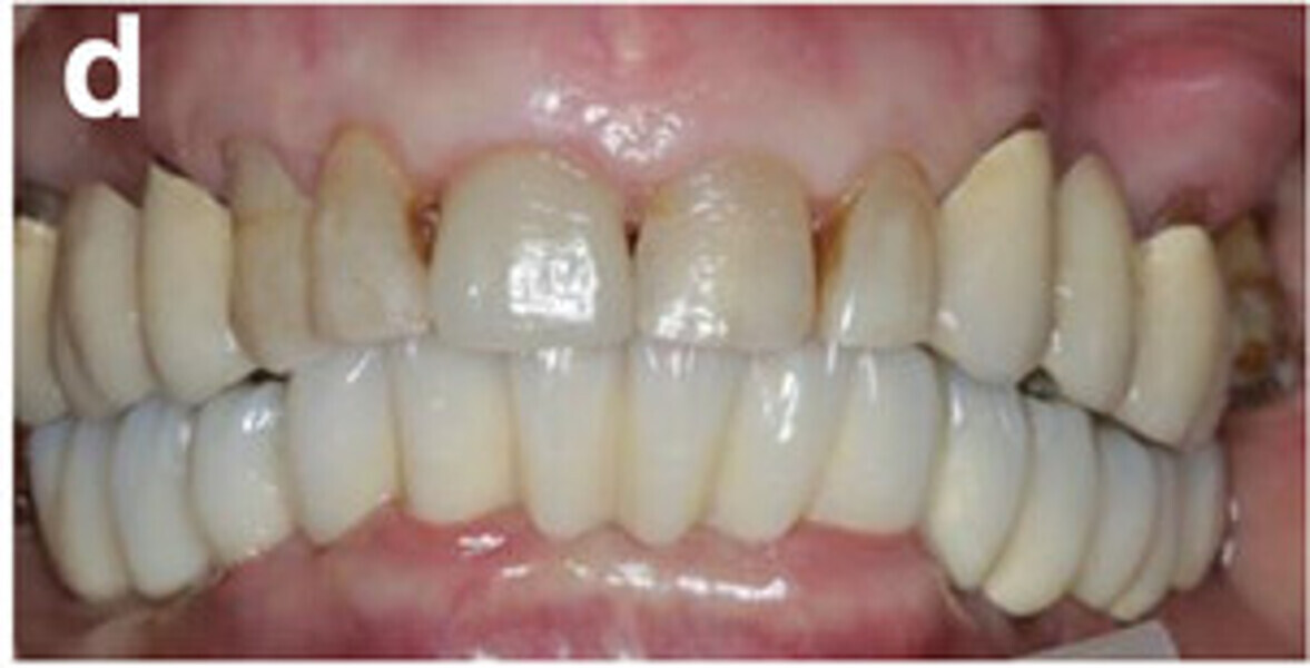 Fig. 14e: Occlusal, frontal and lateral views on the day of delivery, showing healthy peri-implant mucosal conditions (a) and the final CAD/CAM restoration in situ (b–e).