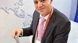 Dr Meir Mamraev at the Cortex booth showing a model of the Magix implant. (Photograph: Franziska Beier, DTI)