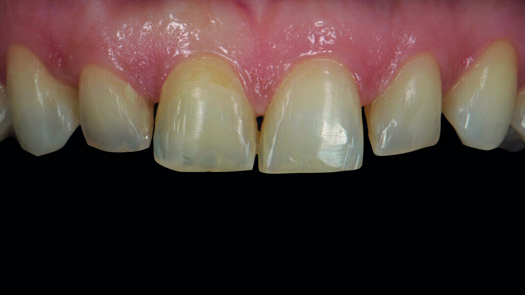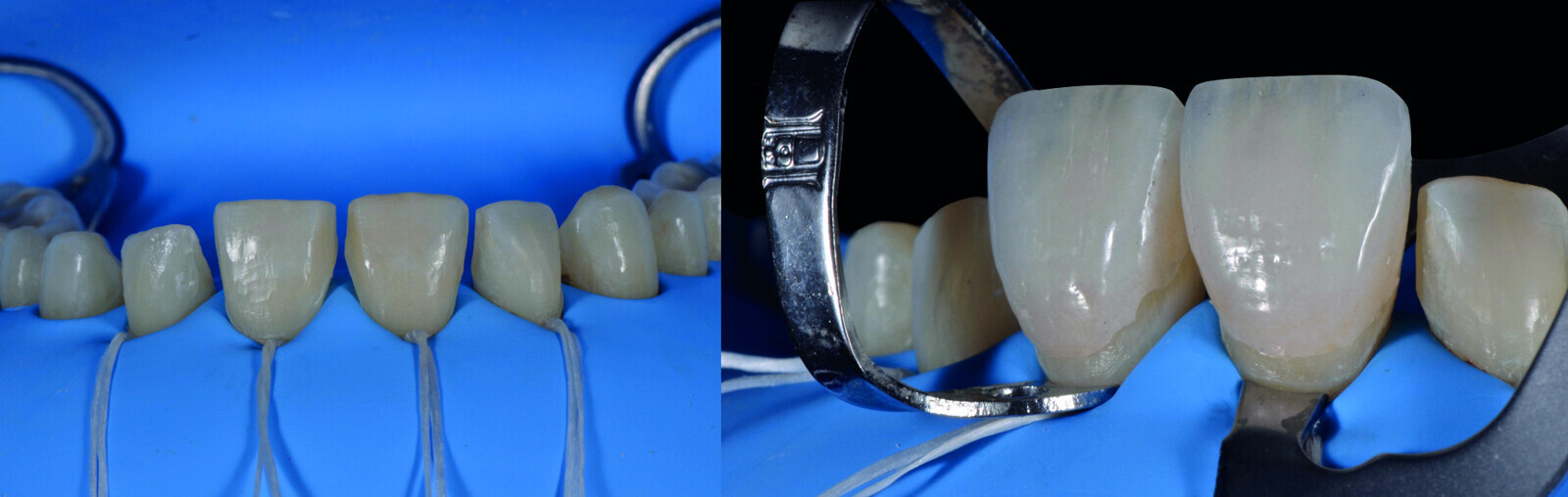 Fig. 16a: Isolation fi eld and try-in of the fi t of the veneers on teeth #11 and 21.