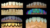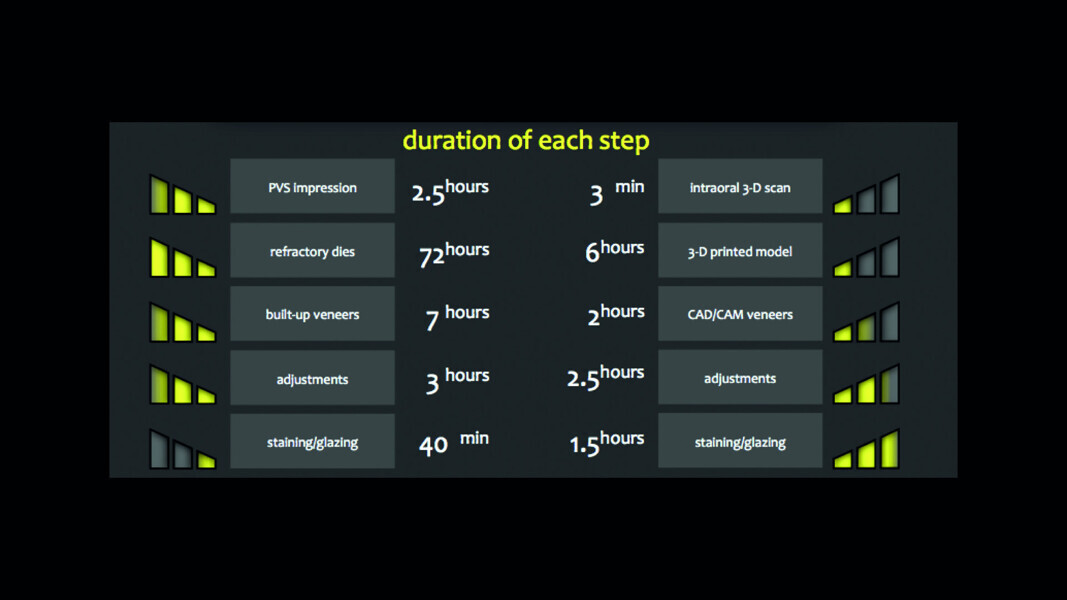 Fig. 14: Digital workflow (3-D printed model, CAD/CAM veneers, adjustments, staining/glazing).