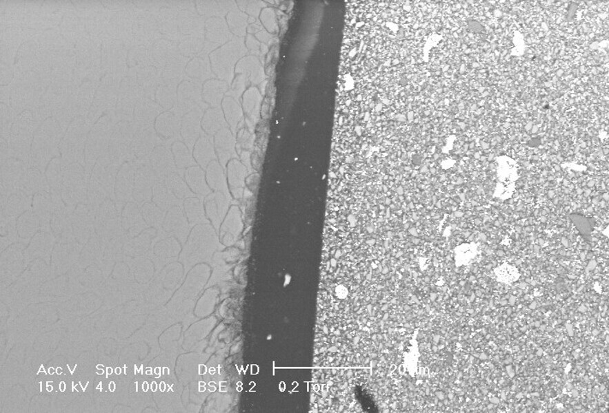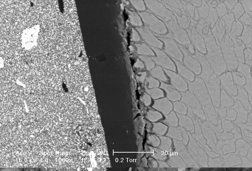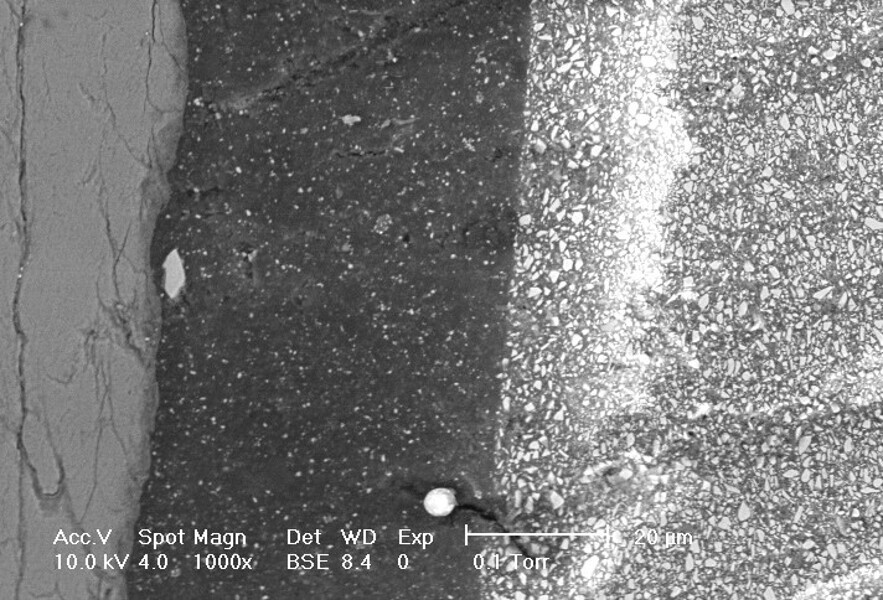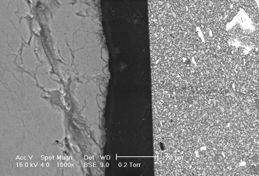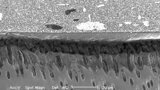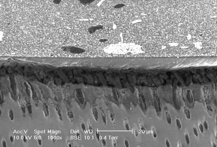 Fig. 12: Microscopic view of demineralised dentine and penetration of the hybrid layer into dentinal tubules.[5]