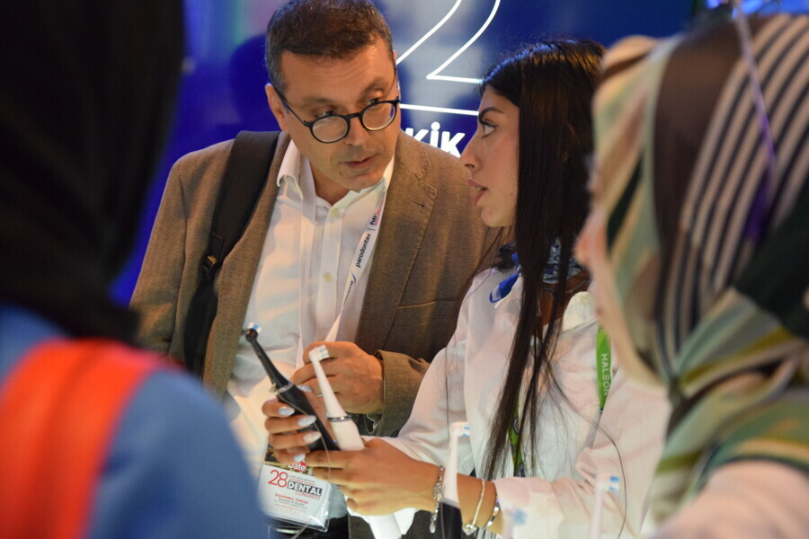 Participants engaging with the latest precision dentistry devices at the EMS booth.
