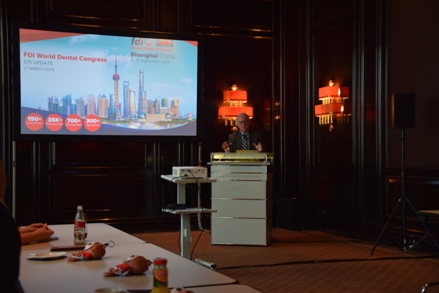 FDI President Dr Greg Chadwick speaking at a press reception held during IDS 2025.