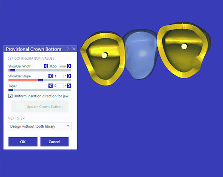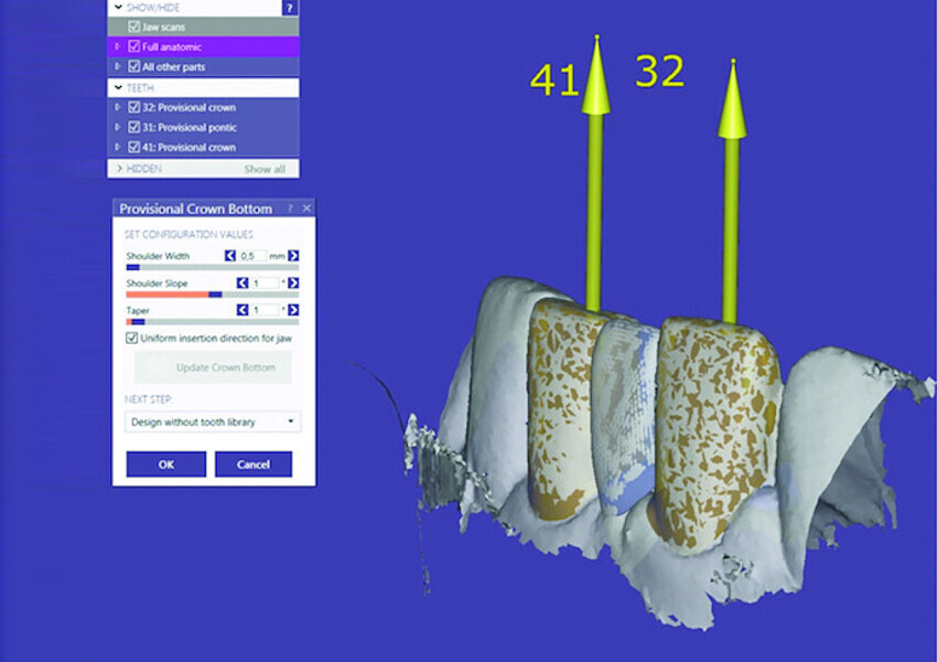 Fig. 4: Creating eggshell temporaries for tooth #45 with the exocad provisional module.