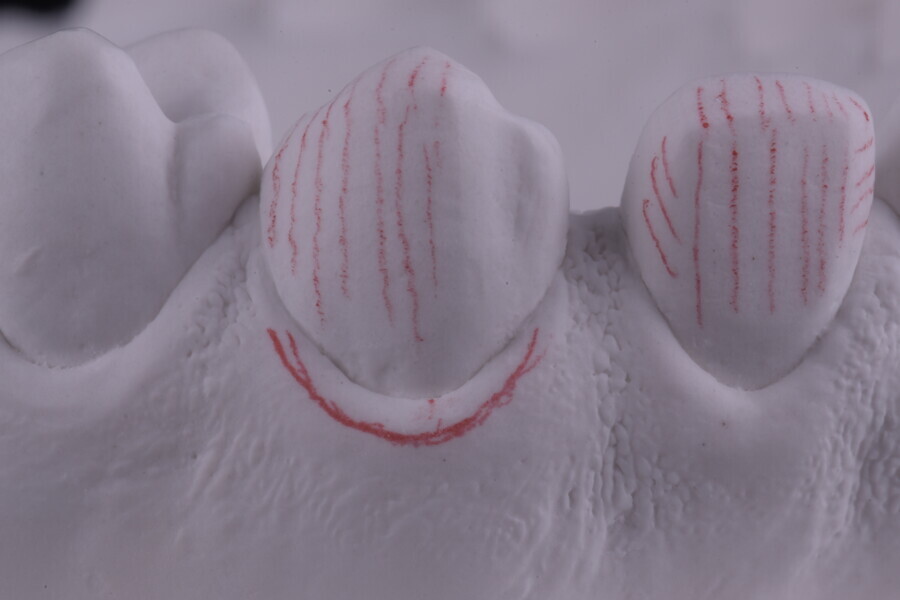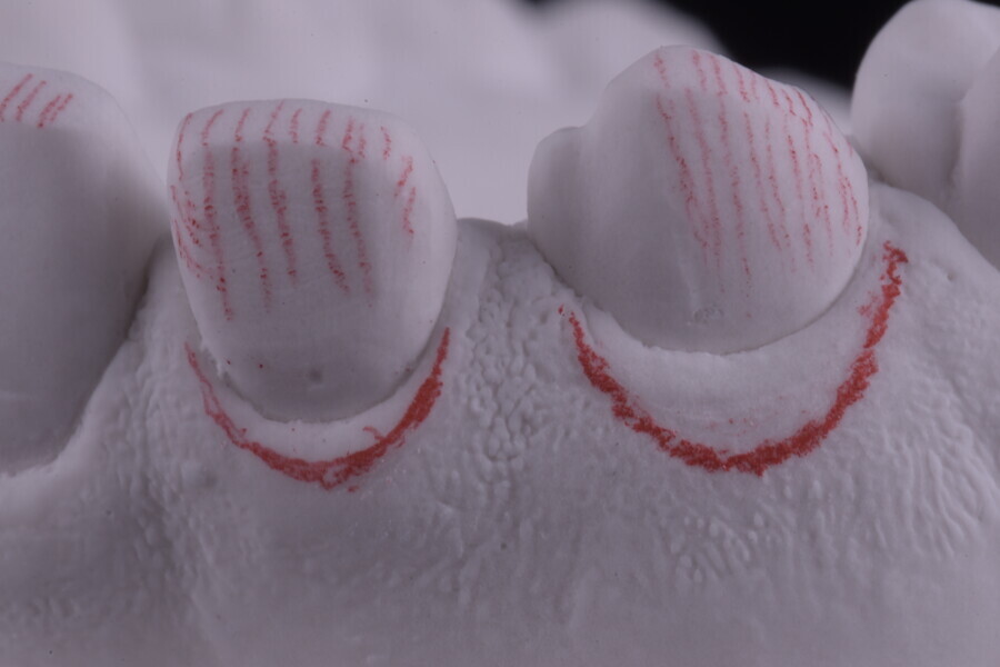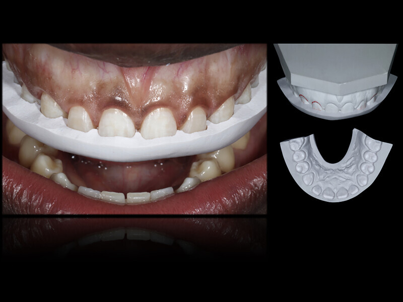 Fig. 51: Silicone index for crown lengthening and the new prosthetic marginal design marked in the cervical area with a black pen.