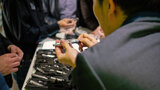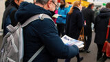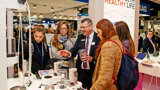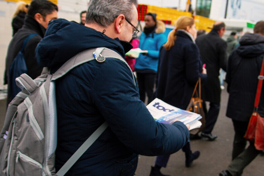 Dental professionals receiving the today at IDS newspaper from Wednesday. (Photograph: Luke Gribble, DTI)
